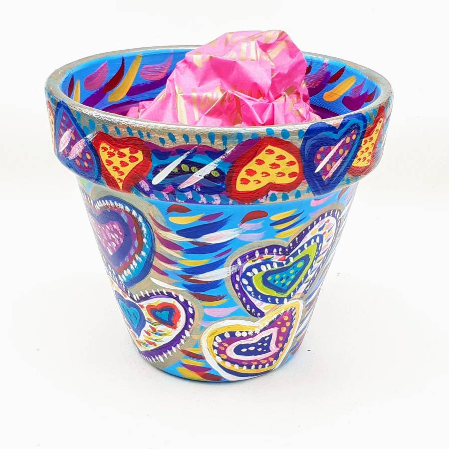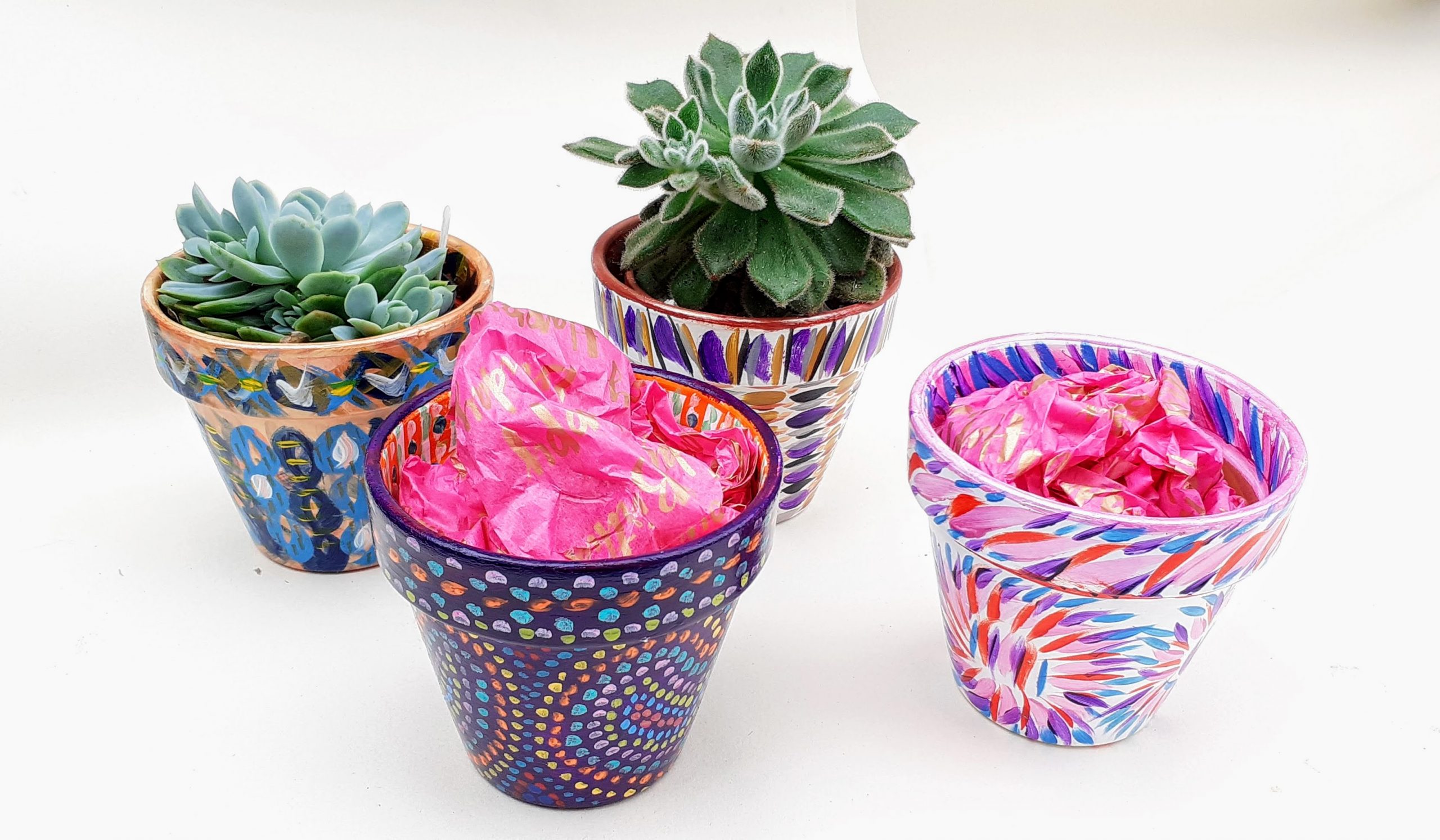 Terracotta pots painted in vibrant acyrilic paints in abstract designs, all totally one off productions.